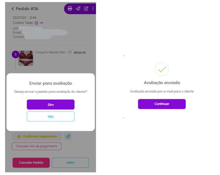 ⚠ ️ Se o pedido não tiver e-mail, não será possível enviar a avaliação.