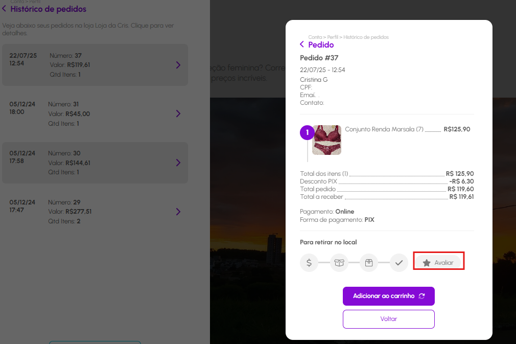 Caso o consumidor esteja logado na sua conta, ele poderá acessar seu histórico de pedidos (menu conta - histórico de pedidos) e ao acessar o pedido, clicar em ⭐ Avaliar.