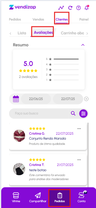 O vendedor pode acessar suas avaliações em Pedidos > Clientes > Avaliações. Nessa tela, dá para ver e filtrar os produtos avaliados e seus comentários, além de visualizar um resumo geral da loja.