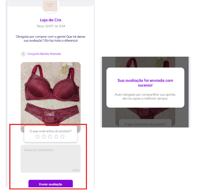 Na tela de avaliação, o cliente vê os produtos do pedido e pode dar uma nota para cada um. A nota com estrelas é obrigatória, mas o comentário é opcional. Ele pode avaliar cada produto separadamente, mas não precisa avaliar todos. Depois de terminar, o cliente é redirecionado para a loja.