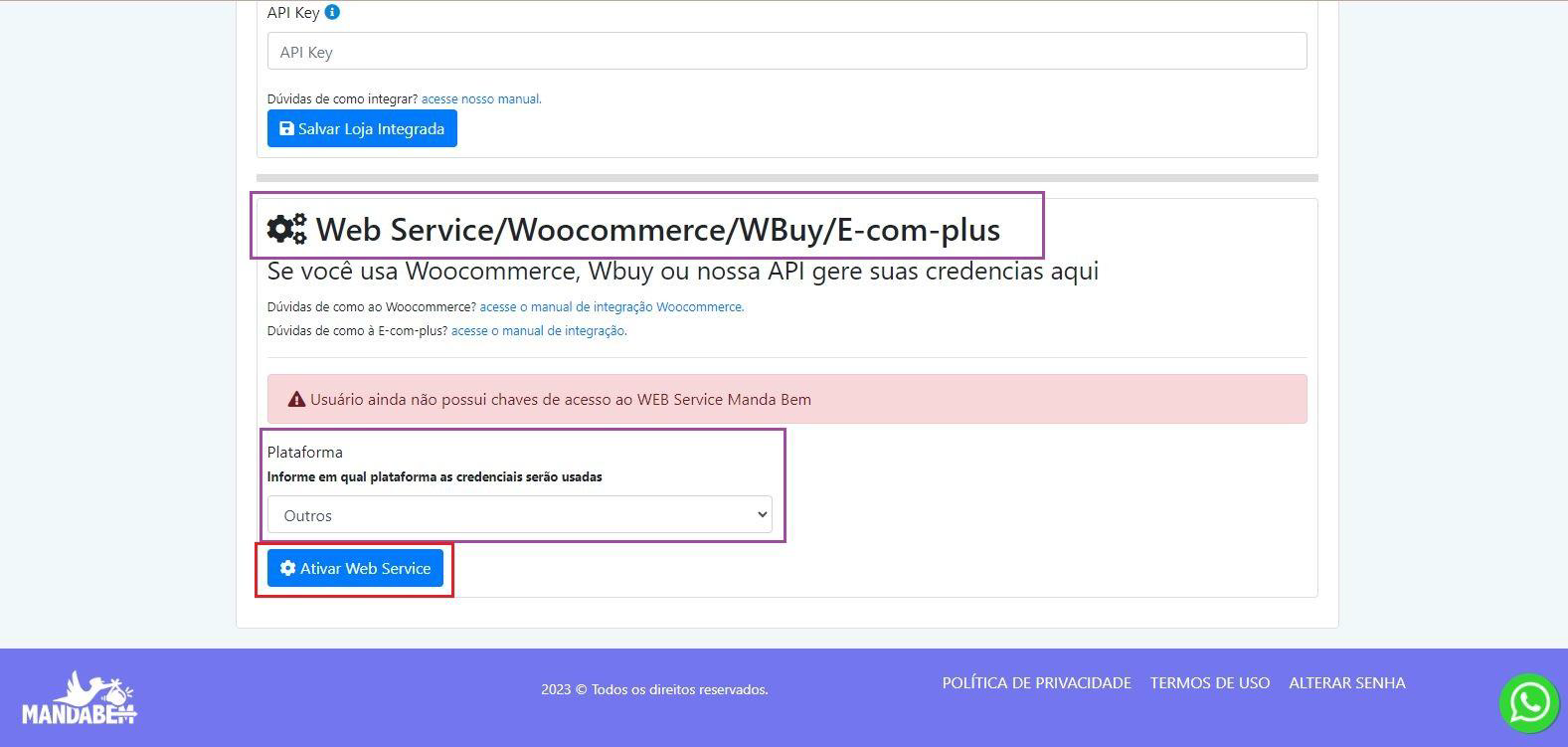 Em - Plataforma: Informe em qual plataforma as credenciais serão usadas, na seta para baixo escolha a opção “Outros”. Em seguida clique em Ativar Web Service.