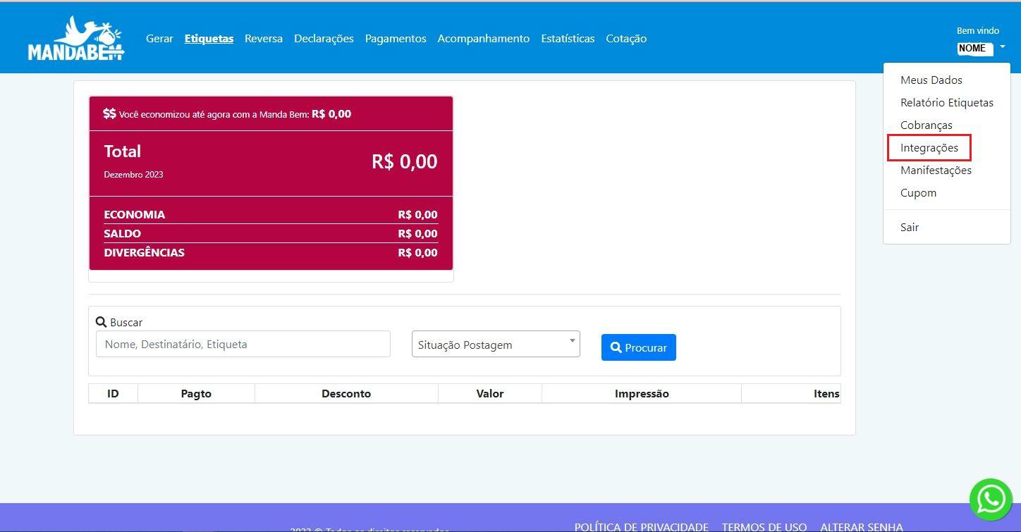 Assim que sua conta for liberada, acesse a plataforma Manda Bem e vá ao canto superior direito, onde está seu nome: