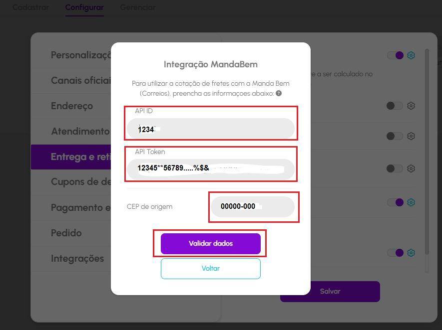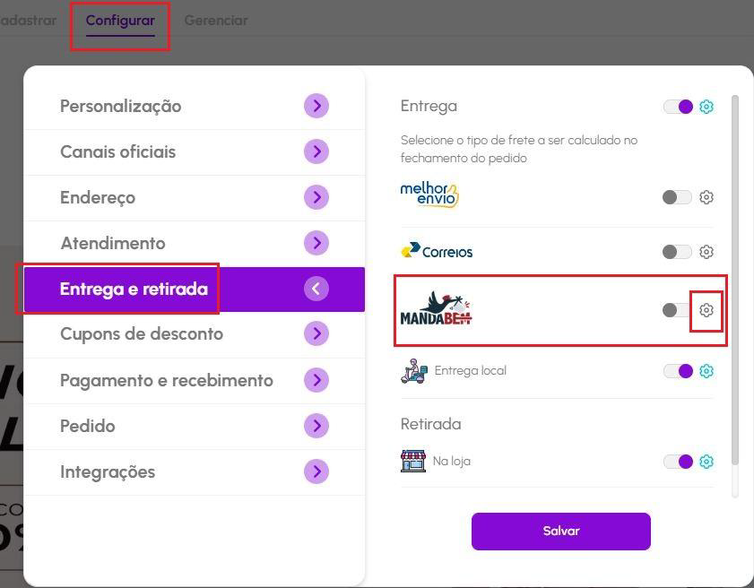 Volte à Vendizap no menu Configurar - Entrega e retirada - Ative o Manda Bem e clique na engrenagem.