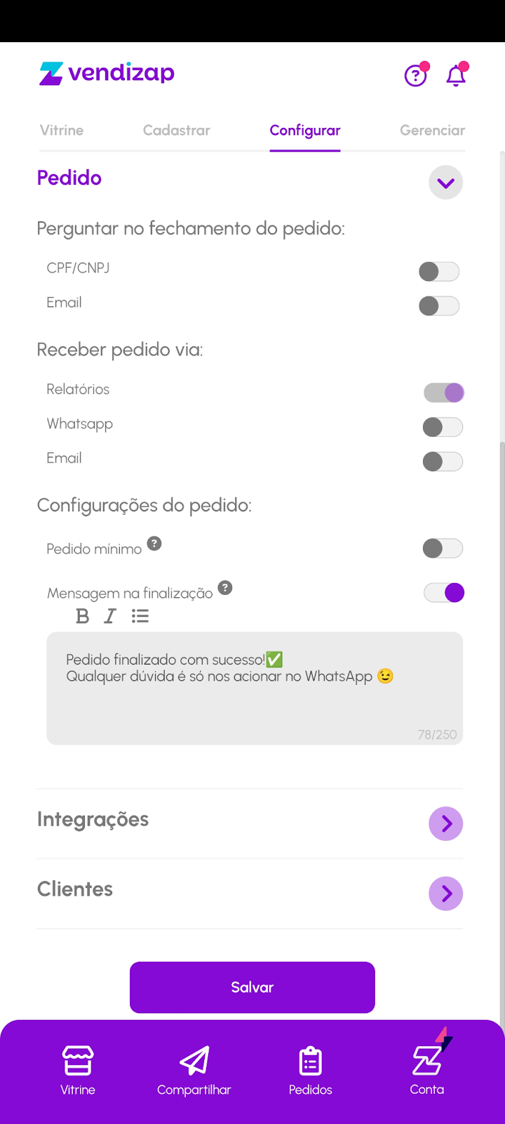 Se a sua conta Vendizap não tem nenhuma integração ativa, você pode configurar para que o cliente não precise informar CPF/CNPJ para finalizar o Pedido, para isso acesse: